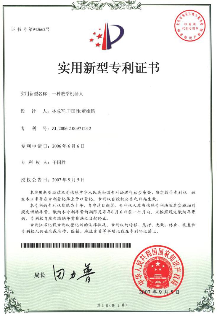 本网讯 (记者 鱼昆 报道)9月5日,国家知识产权局正式授权公告,授予公司计算机工程系副主任干国胜副教授研制的“一种教学机器人”专利权,并颁发了实用新型专利证书。