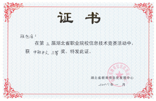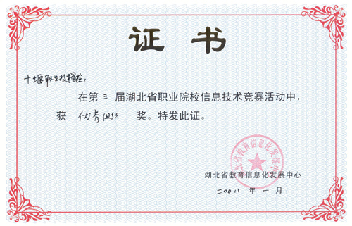 新闻网讯 近日,湖北省教育信息化发展中心表彰了湖北省第三届职业院校信息技术竞赛获奖单位及选手,公司计算机工程系员工张旭海同学获高职中文类三等奖,经济贸易系员工徐金凤同学获高职英文类三等奖,计算机工程系员工邓浇华、黄芳、王芳、经济贸易系员工管海翠、林宽同学获高职中文类优秀奖,十堰职业技术公司获优秀组织奖。