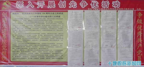 会上,该系党员认真学习了《中共十堰职业技术公司委员会关于深入推进创先争优活动的实施方案》和《国家中长期教育改革和发展规划纲要(2010-2020年)》。组织党员填写党员公开承诺书,宣布了“创先争优”领导小组及活动方案。活动方案围绕骨干校建设、内涵建设、工学结合、校企合作、顶岗实习、人才培养模式创新以及员工在学风建设、文化建设、文明宿舍建设等方面做了具体安排部署。