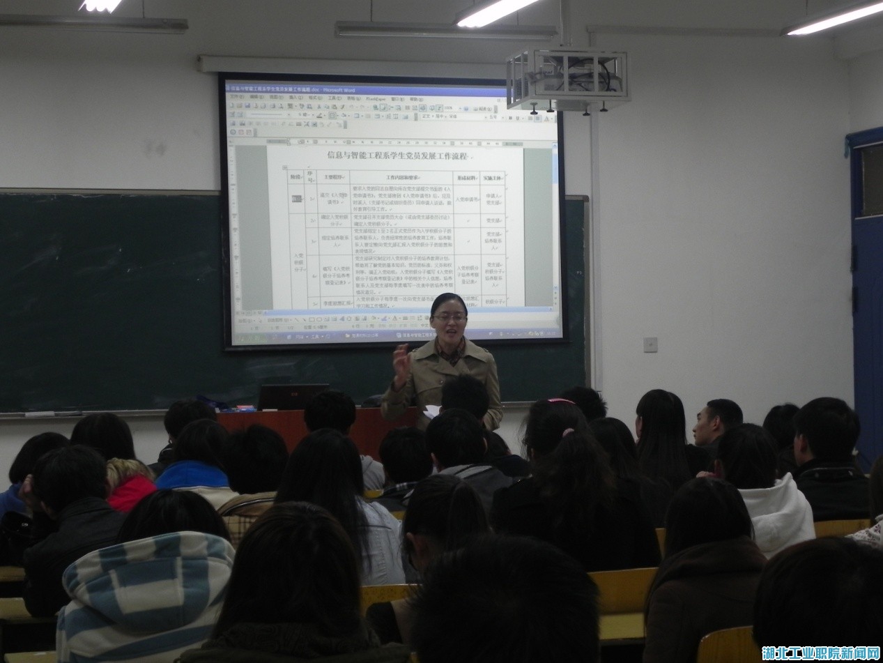 新闻网讯(员工记者 谢竹)11月5日晚,信息与智能工程系组织2013级新生及2012级入党积极分子在4401教室召开员工党员发展工作流程座谈会。辅导员陈黎及肖玉参加了本次活动。座谈会由该系党总支书记莫足琴主持。