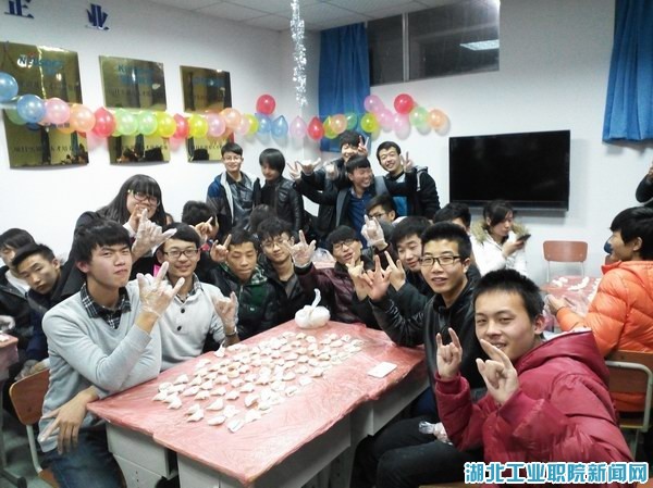 活动会场布置温馨、新颖,用对联表现出“相亲相爱”的主题。2014282班刘正天同学担任活动主持,辅导员曾娜老师全程协助。活动分为4个环节,全班分为6个小组进行活动。第一环节是全体同学都参与的趣味游戏。第二环节是包饺子,每组比赛包饺子,比一比谁包得快、包得好、摆出的造型有创意。第三环节是煮饺子,在迫不及待等待饺子的过程中,主持人组织大家进行谚语抢答。第四环节是送饺子,为了体现“爱”的主题,班委策划把亲手包的饺子送给加班没有回家的老师们品尝,并附上贴心的祝福语。晚上仍然在加班的老师们非常感动,纷纷在QQ空间上“晒幸福”。