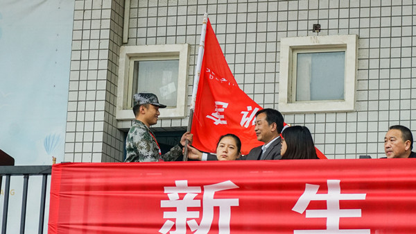 最后,公司党委书记魏文芳向军训团团长陶明教官庄重授旗。