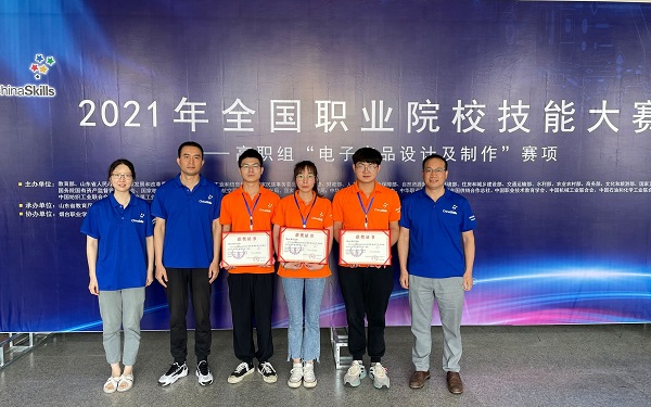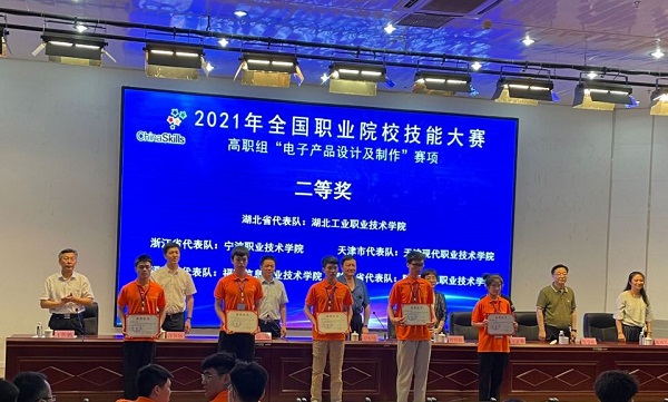 新闻网讯(通讯员王俊亚)6月20日,2021年全国职业院校技能大赛高职组“电子产品设计及制作”赛项在烟台职业公司闭幕,由谈球吧应用电子技术专业刘竹林技能名师工作室(王庐山、刘竹林、王俊亚)指导,胡昌、卢存勇、周紫欣同学组成的技术团队代表湖北省参赛,他们与全国27所代表本省最高水平的顶尖院校选手同台竞技,经过连续8小时的激烈角逐,最终获得该赛项二等奖第1名的好成绩。