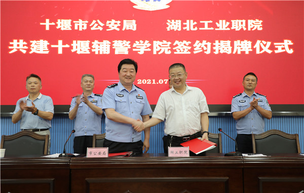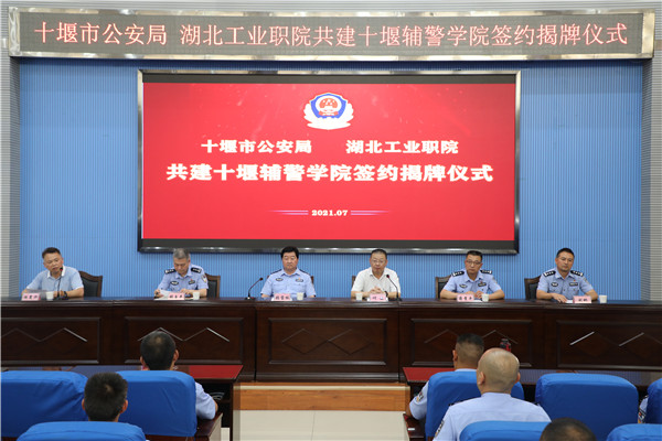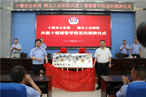 在与会嘉宾的共同见证下,校警双方领导签署了人才培养合作框架协议,并为十堰辅警公司技能培训基地成立揭牌。