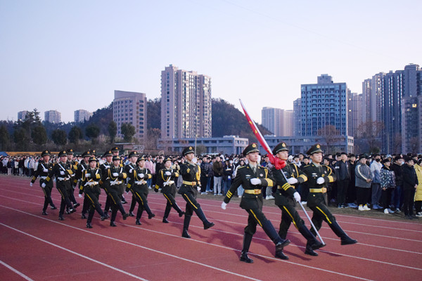 在全体师生的注目礼下,英姿飒爽的校国旗护卫队队员们护送鲜艳的五星红旗进场,伴随着庄严的《中华人民共和国国歌》,五星红旗冉冉升起,迎风飘扬。